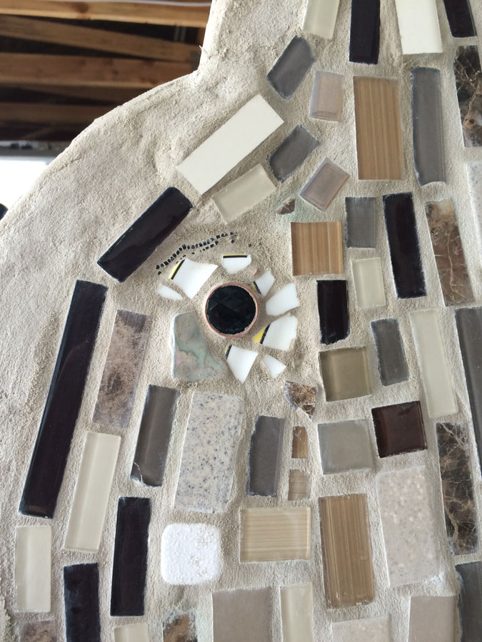 Sculpture Jam October 2015, on the patio at the Sebastopol Center for the arts, Coyote comes together. The 7' WEDI board, concrete, and tile animal howls and wiggles her/his ears as his/her jaw opens. The interactive sculpture is planned for the plaza where she/he can join her cousin on the mural on the Elks Hall wall on HW 116 at Weeks Way.  We want to thank the manufacturers of WEDI board for their generous contribution! This material was PERFECT AND EXCELLENT for this sculpture project. It worked easily, cut the weight of the sculpture and made it possible to shape this large piece. It's used in construction for tile underlayment and insullation.
